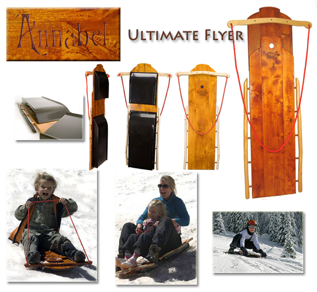 Ultimate Flyer Sled is an elegant, hand-made beauty that glides and turns like no other wooden sled you have ever tried. The entire front section of the sled pivots, letting you make much sharper turns than on a conventional flexible flyer. And, it looks great standing on the porch in between sled runs. The Ultimate Flyer sled is made to last for generations: thick birch planks, hand-carved willow hand rails and stainless-steel hardware make it tough, and we can hand-engrave a childs name right onto the sled. (Please note that the addition of lettering can add 1-2 days to the delivery time). Lettering is 2" tall and runs lengthwise up the center of the sled.